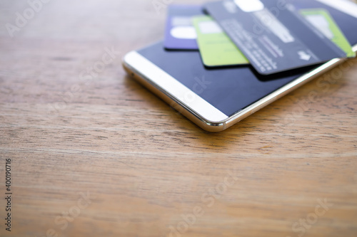 Credit cards on mobile with wooden background. for shopping online or payments without cash. Business and financial concept.