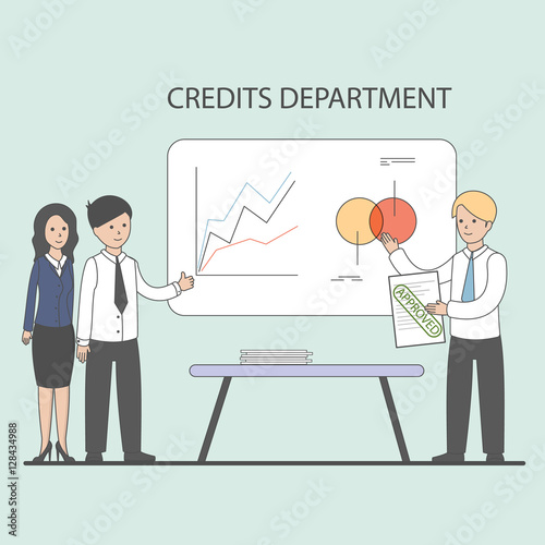 Credits department concept. Indoors office of bank with workers and graphics. Solving the problems, making plans.
