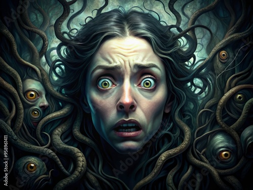 Creepy, dimly-lit illustration of a person's face with eyes wide in terror, surrounded by eerie, swirling shapes and