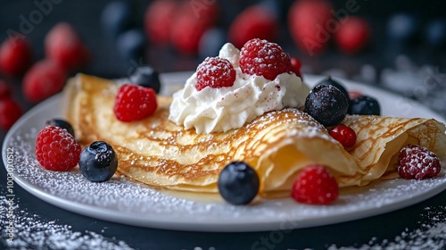Crepes with fresh berries and whipped cream, placed on a glossy white surface with a dramatic black-and-red backdrop