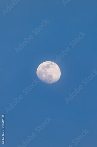 Crescent moon on daytime sky. The moon in the daytime on a blue sky with a light haze. Crescent moon to 3/4 of visible surface.