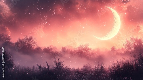 Crescent Moon over Misty Forest at Night