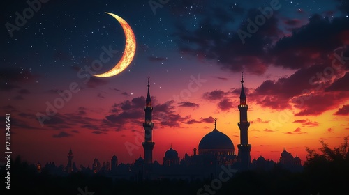 Crescent moon over mosque at sunset, Ramadan greeting