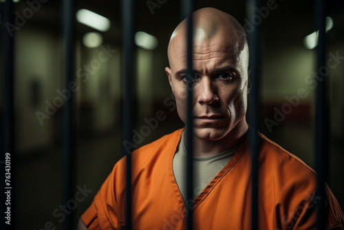 Criminals jailed in prison in orange uniform behind metal bars Generative AI realistic 3D picture