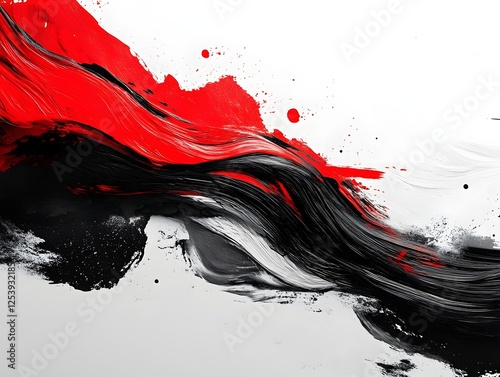 Crimson and Coal: Abstract artwork featuring dynamic strokes of red and black paint, creating a sense of movement and energy. The contrast between the colors is striking.