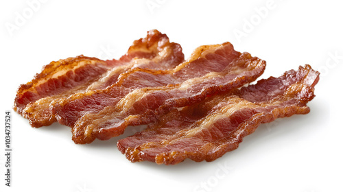 Crisp Fried Bacon on White, vibrant close-up of perfectly cooked bacon against a clean white backdrop, ideal for e-commerce display