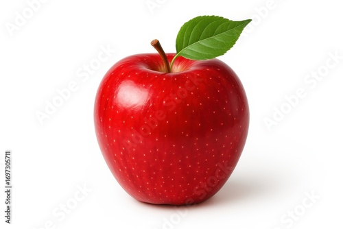 Crisp Red Apple with Leaf: A vibrant, ripe red apple with a fresh green leaf, photographed close-up, emphasizing its natural beauty and freshness.