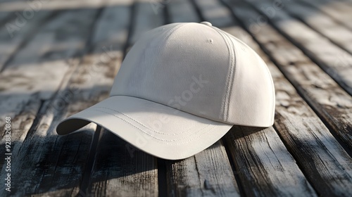 Crisp white baseball cap, close-up product shot, wooden plank background, soft shadow, subtle fabric texture, stitching details, curved brim, centered composition.