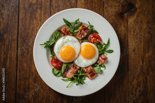 Crispy bacon and sunny eggs served with fresh arugula and tomatoes on a white dish, overhead shot on rustic wooden surface