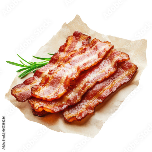 Crispy Bacon Strips on Brown Paper with Fresh Herbs isolated on transparent background.