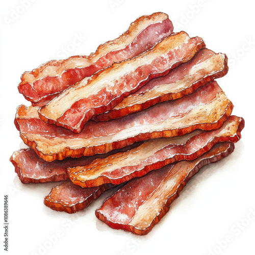 Crispy bacon strips stacked together, showcasing their delicious texture and color. This watercolor illustration captures savory appeal of bacon,