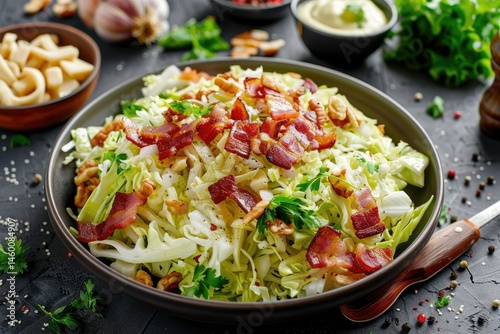 crispy cabbage salad with bacon and mustard mayonnaise styled for food photography with spices, herbs, and a dark background
