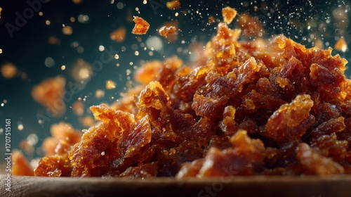 Crispy caramelized textures against a dark backdrop under gentle illumination
