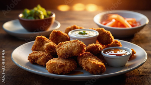 Crispy chicken nuggets served with dipping sauces and fresh sides during a sunset meal