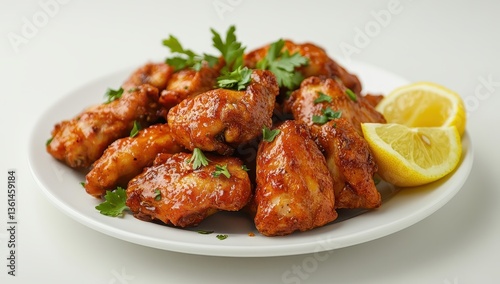 Crispy Chicken Wings Garnished with Fresh Herbs and Lemon Slices on White Plate Perfect for Appetizers and Party Snacks