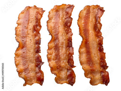 Crispy Cooked Bacon Strips Close Up Isolated on transparent background cutout, PNG file, Cutout file