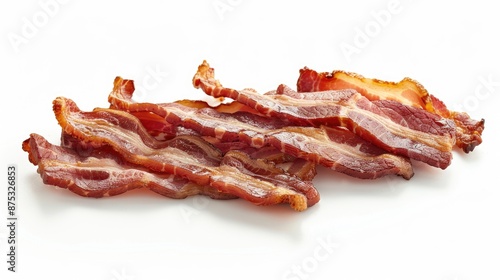 Crispy, delicious bacon strips on a white background, perfect for breakfast ads, cooking blogs, and food-related content.