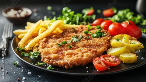 Crispy Fried Chicken Cutlet with Fresh Vegetables and Fries