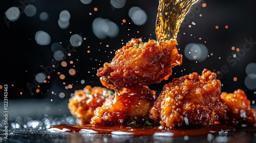 Crispy fried chicken pieces drizzled with a glossy sauce, set against a blurred background.