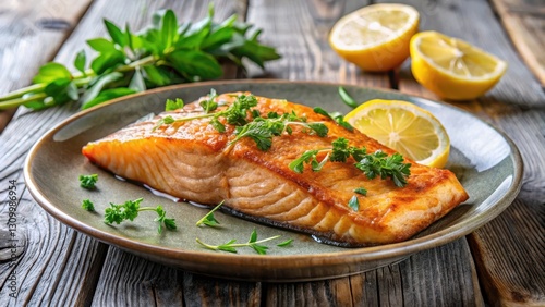 Crispy golden brown salmon fillet on a plate with lemon wedges and fresh herbs