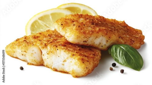 Crispy Pan-Seared Fish Fillets Garnished with Lemon and Basil over White Background.