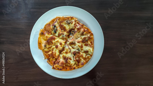 Crispy thin crust pizza with mushroom and sausage on white plate on wooden table