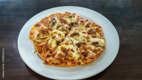 Crispy thin crust pizza with mushroom and sausage on white plate on wooden table