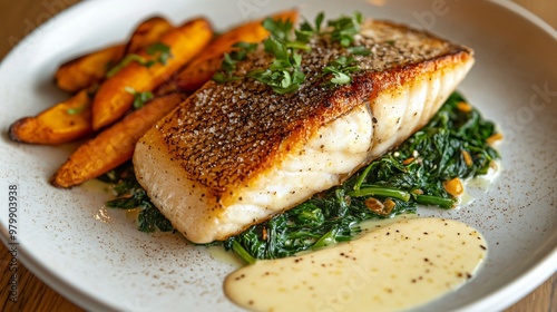 Crispy-skinned sea bass on a bed of sauteed greens, paired with a side of roasted baby carrots and a lemon beurre blanc drizzle on a large oval dish