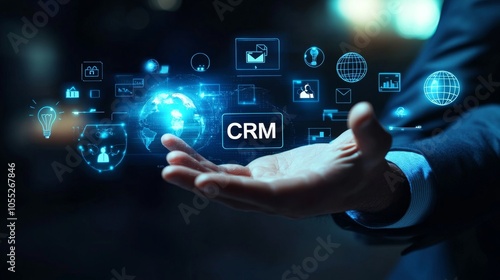 CRM Customer Relationship Management in hologram holding hand businessman, Business, Technology, Internet and network concept
