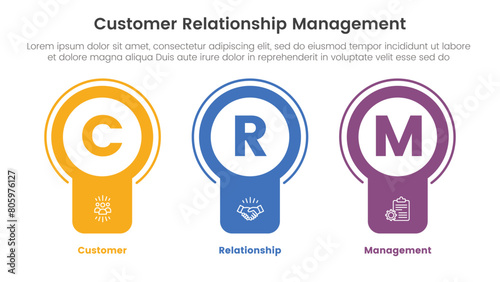 CRM customer relationship management infographic 3 point stage template with badge circle banner shape for slide presentation