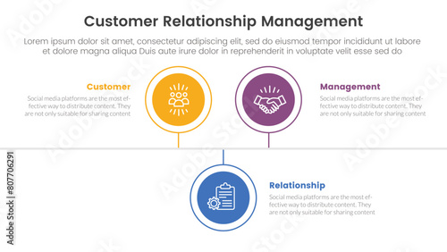 CRM customer relationship management infographic 3 point stage template with circle timeline right direction up and down for slide presentation
