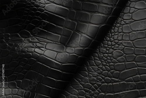Crocodile leather texture showcases intricate patterns in deep black color for upholstery and fashion applications