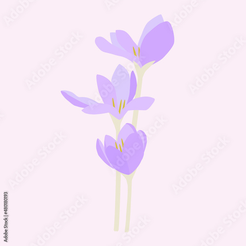 Crocus springtime flowers, blooming purple buds with yellow middle, spring beautiful flowers isolated on white background, vector illustration blossoms