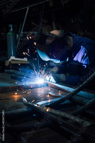 Crop faceless worker in gloves and uniform welding metal details on table near constructions in factory