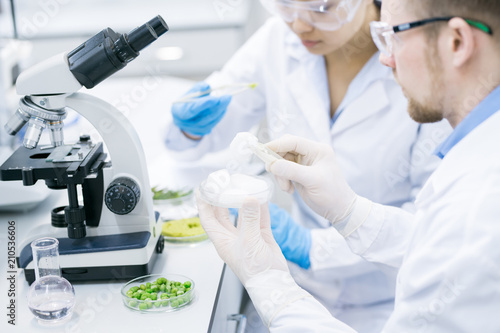 Crop side view of scientists in glasses sitting at laboratory desk with flasks and microscope and analyzing samples of green vegetables in Petri dishes