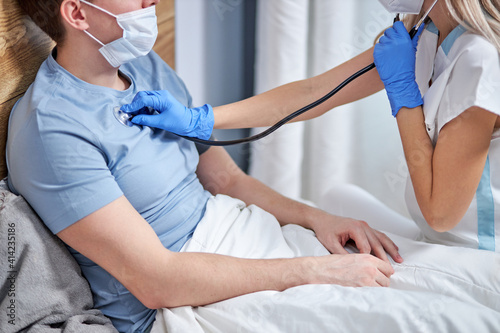 cropped man sick of flu viral infection in home isolation quarantine, lie on bed while doctor is listening to breath using stethoscope. covid-19 concept