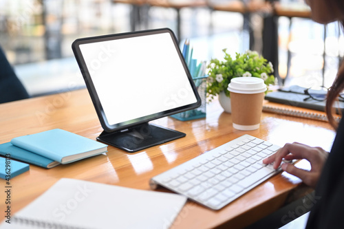 Cropped shot of businesswoman analyzing business data on digital tablet while sitting in modern workplace.