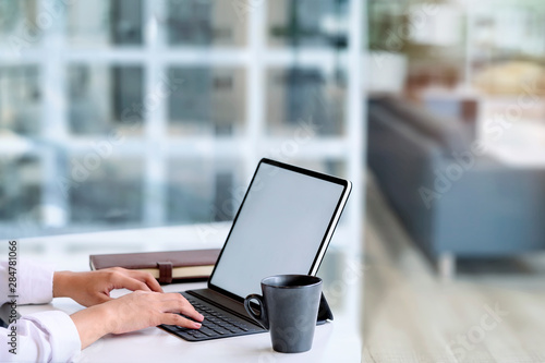 Cropped shot of female hands using tablet with keyboard in living room.