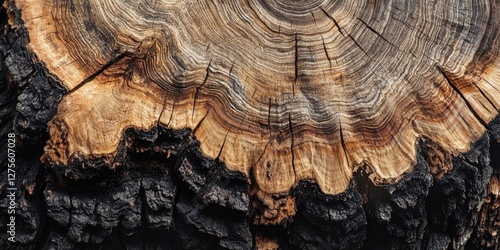 Cross section of a tree stump showcasing intricate rings and textures with warm brown tones and dark edges highlighting natural beauty and fine details