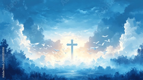 Cross symbol standing tall in a blue sky with white clouds and doves flying around it.