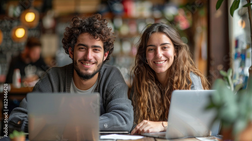 cross-cultural collaboration, at a co-working space, a hispanic entrepreneur and his middle-eastern partner brainstorming a new startup idea, surrounded by laptops and notebooks