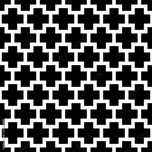 Crosses wallpaper. Repeated black figures on white background. Seamless surface pattern design with polygons. Mosaic motif. Digital paper for page fills, web designing, textile print. Vector art.