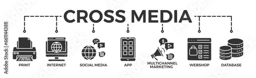 Cross-media banner web icon glyph silhouette with icon of print, internet, social media, app, multichannel marketing, webshop and database