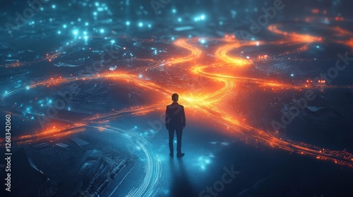 crossroads of multiple glowing paths, choosing the best direction for growth