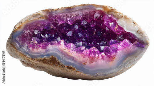 Cross-section of a natural amethyst geode revealing vivid purple crystals and layered mineral structure, isolated on white background.