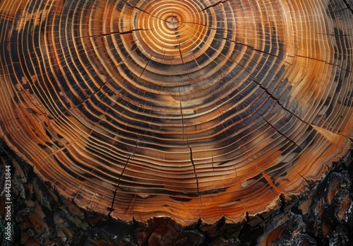 Cross-section of a tree trunk showing its growth rings and the detailed texture of the wood grain