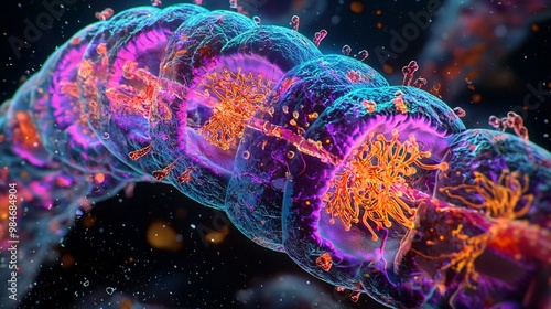 Cross-sectional view of a mitochondrion showing the citric acid cycle. Dark background with vibrant details.