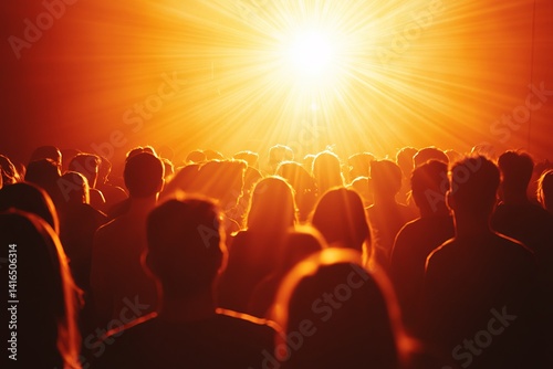 Crowd at a concert with bright light shining from stage, creating a warm orange and yellow glow, capturing the excitement and energy of live music events