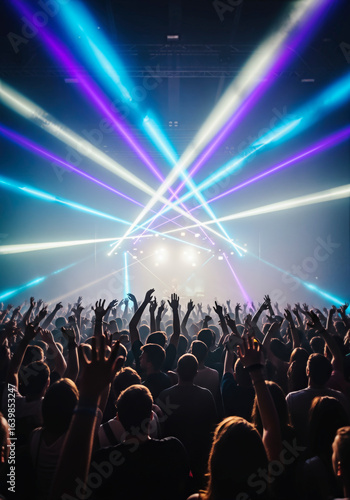Crowd enjoying a concert under bright stage lights. An exciting view of the music scene. Live entertainment, fan enthusiasm, nightlife experience.