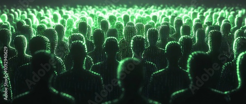 Crowd with Heads Composed of Glowing Green Binary Code. AI generated illustration